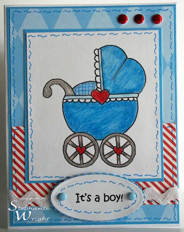 I colored the buggy with my prismacolor pencils. The doodles were made with a Zig Writer pen. The sketch came from CPC-ST100 and it also qualifies for Really Reasonable Ribbon's Challenge #20 (One for the Boys).